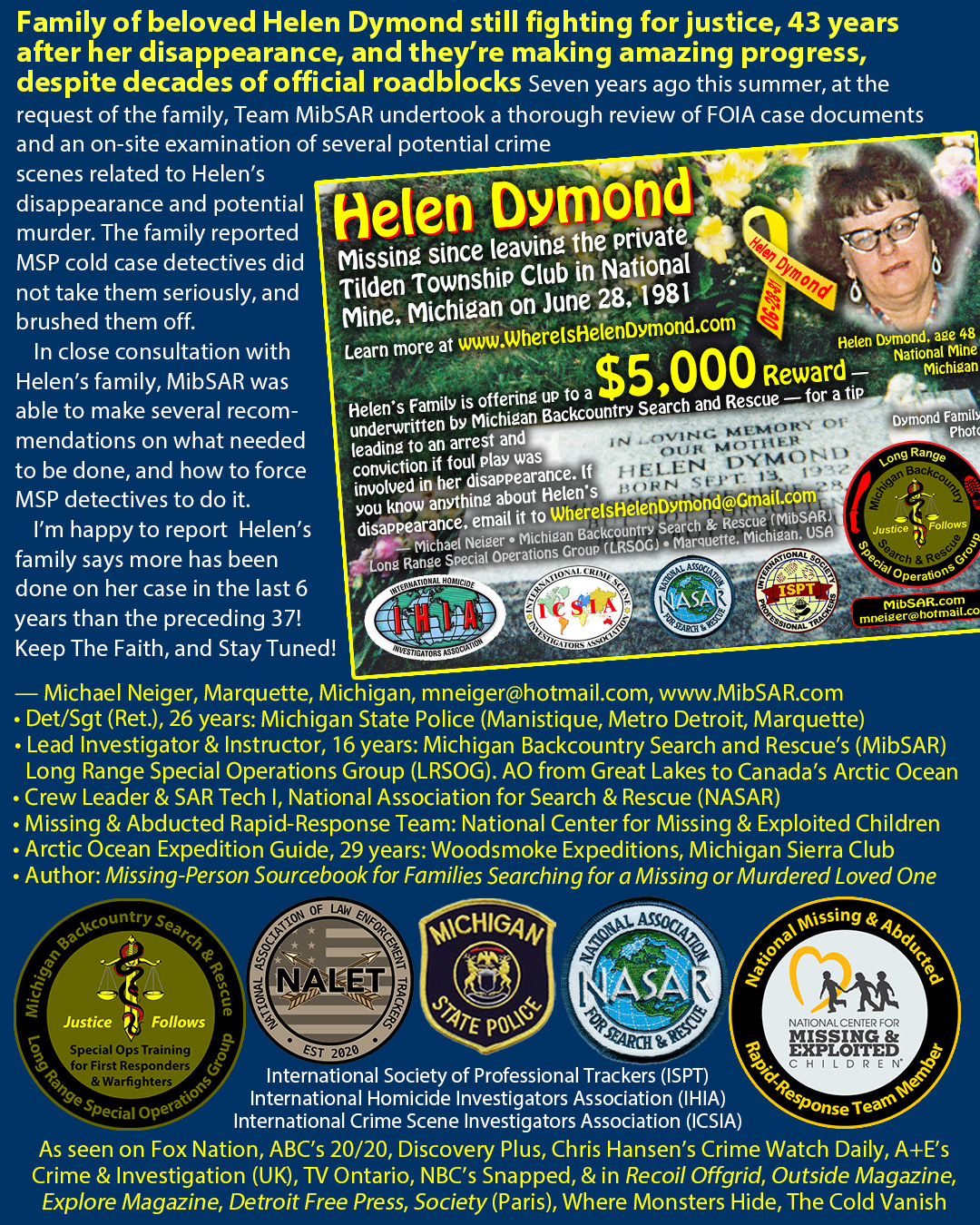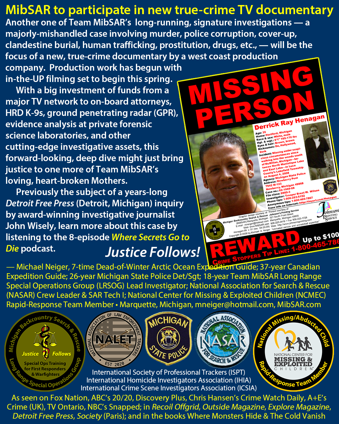 - April 15, 2025 TEAM MibSAR TO PARTICIPATE IN NEW 2025 TRUE-CRIME TV DOCUMENTARY: Another one of Team MibSAR’s long-running, signature investigations -- a majorly-mishandled case involving murder, police corruption, cover-up, clandestine burial, human trafficking, prostitution, drugs, etc. -- will be the focus of a new, true-crime documentary by a west coast production company. Pre-production filming is underway, with filming set to begin in the Upper Peninsula this summer. A huge infusion of funds from a major TV network will allow us to on-board FOIA attorneys, HRD K-9s, ground penetrating radar (GPR), evidence analysis at private forensic science laboratories, drones, and other cutting-edge investigative assets. As with most Team MibSAR investigations, the aim of this deep dive into the 2008 murder of Derrick Henagan is to bring justice to one more of the Team’s loving, heart-broken Mothers. The subject of a years-long Detroit Free Press (Detroit, Michigan) inquiry by award-winning investigative journalist John Wisely, you can learn more about this case by listening to the 8-episode Where Secrets Go to Die serial podcast on Apple Podcast and Spotify.