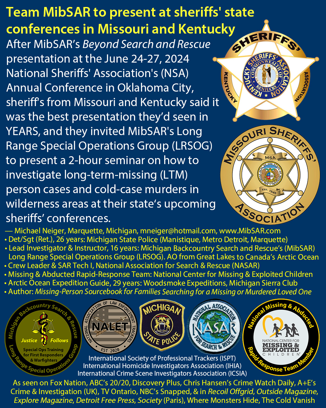- July 2, 2024 After Team MibSAR’s “Beyond Search and Rescue” presentation at the June 24-27, 2024 National Sheriffs' Association's (NSA) Annual Conference in Oklahoma City, sheriff's from Missouri and Kentucky said it was the best presentation they’d seen in YEARS, and they invited MibSAR's Long Range Special Operations Group (LRSOG) to present a 2-hour seminar on how to investigate long-term-missing (LTM) person cases and cold-case murders in wilderness areas at their state’s upcoming sheriffs’ conferences.