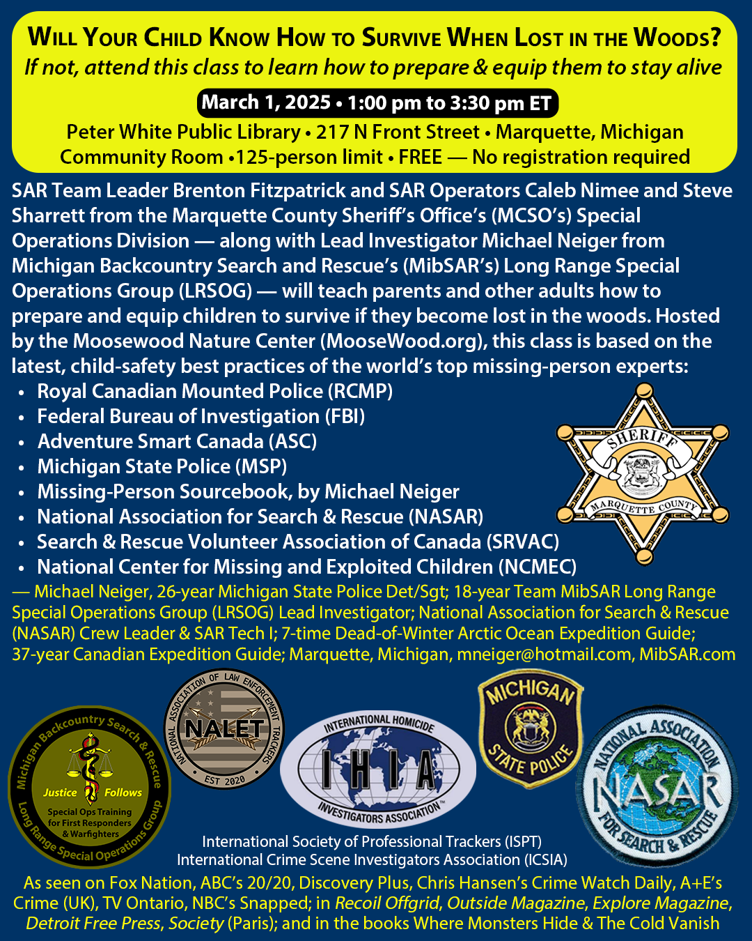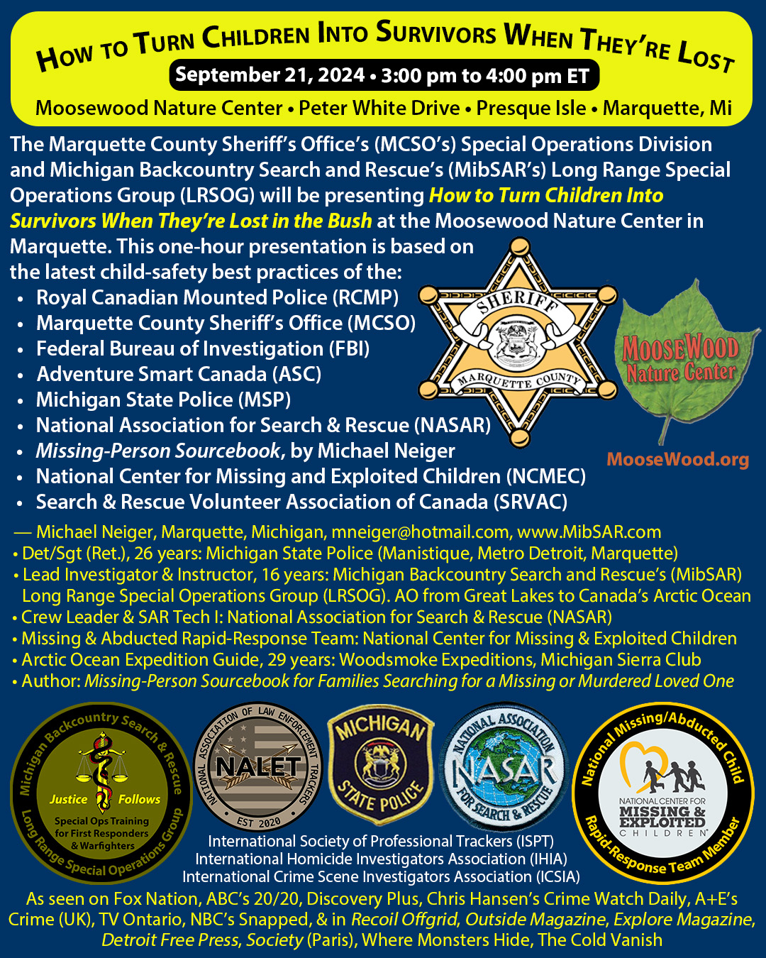 - September 21, 2025 How to Children Into Survivors When They're Lost in the Woods presentation, Moosewood Nature Center (Marquette, Michigan)