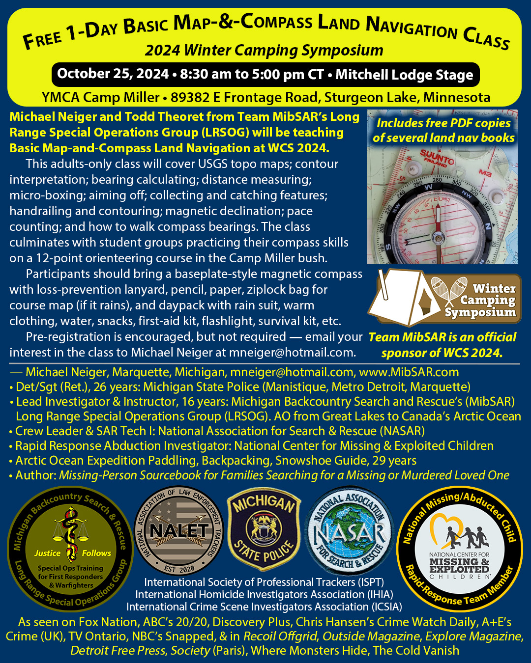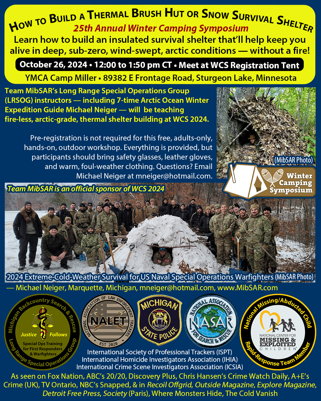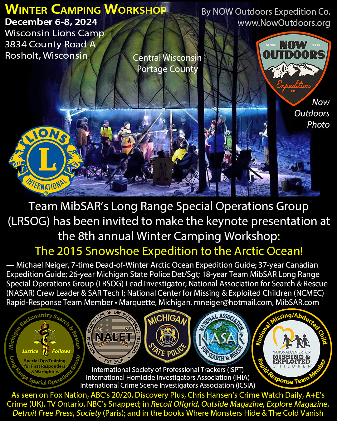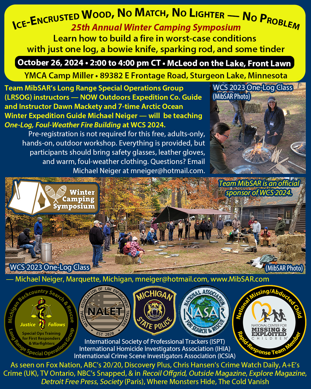 - October 24-27, 2025 Team MibSAR's Long Range Special Operations Group (LRSOG) instructors to teach three workshops at Winter Camping Symposium (Sturgeon Lake, Minnesota)