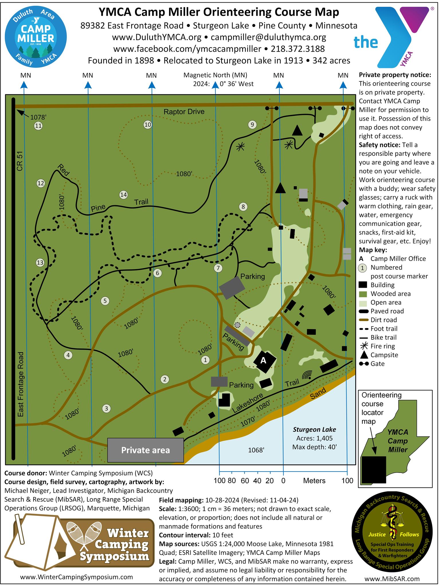 - November 11, 2024 Team MibSAR's Long Range Special Operations Group (LRSOG) designed and mapped a 14-point orienteering course for YMCA Camp Miller's future youth programming (Sturgeon Lake, Minnesota)