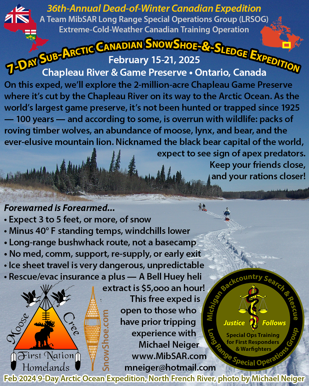 - Februrary 15-21, 2025 7-Day Canadian Sub-Arctic SAR-Training Snowshoe Expedition (Chapleau River & Game Preserve • Ontario, Canada)