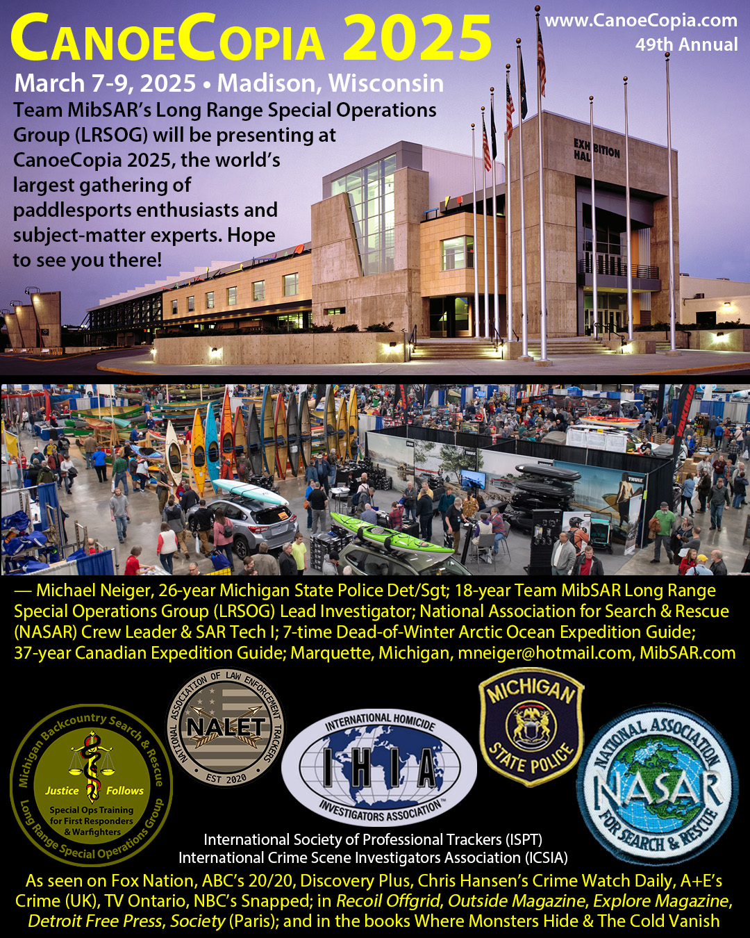 - March 7-9 2025 As part of its community outreach and preventive SAR initiative, Team MibSAR’s Long Range Special Operations Group (LRSOG) made two presentations on March 7-9 at CanoeCopia 2025. One addressed on-person survival kits for wilderness expeditions and the other coached parents and grandparents on how to ensure their child or grandchild is a survivor if they get lost in the bush. Held at the 250,000-square-foot Alliant Energy Center Exhibition Hall, the 3-day CanoeCopia symposium is the world’s largest gathering of paddle-sport, subject-matter experts. Upwards of 20,000 attendees talked to muscle-powered-sports gear vendors, guides, outfitters, authors, instructors, and outdoor schools, or participated in any of over 180 seminars and clinics. It was a pleasure having dinner with my longtime swift-water paddling mentor Cliff Jacobson, and his loving daughters and friends too. Thank you Cliff for the rare opportunity to break bread with you, one of the world’s greatest canoeing legends!
