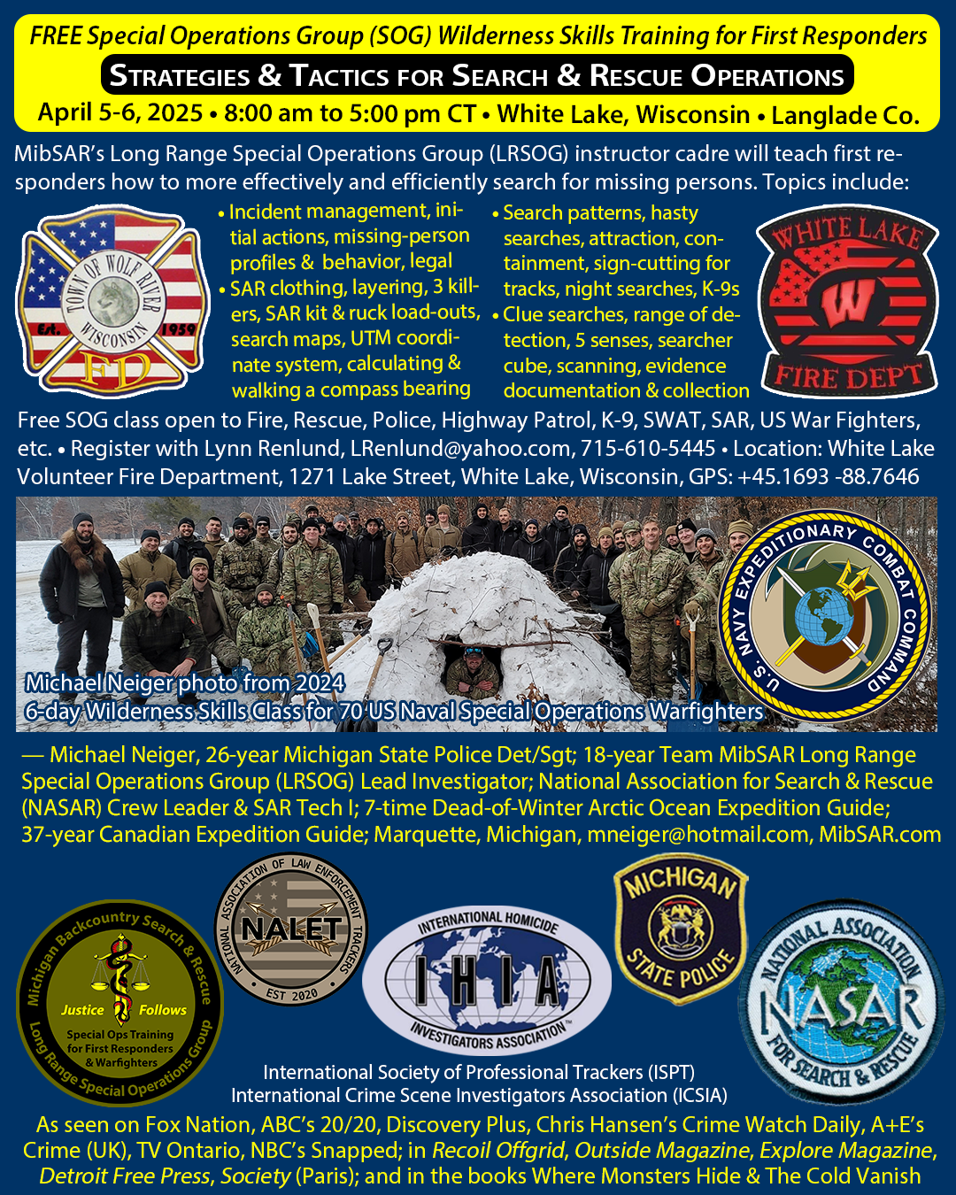 - April 5-6, 2025 Strategies and Tactics for Search for Rescue Operations for First Responder Class (White Lake, Wisconsin)