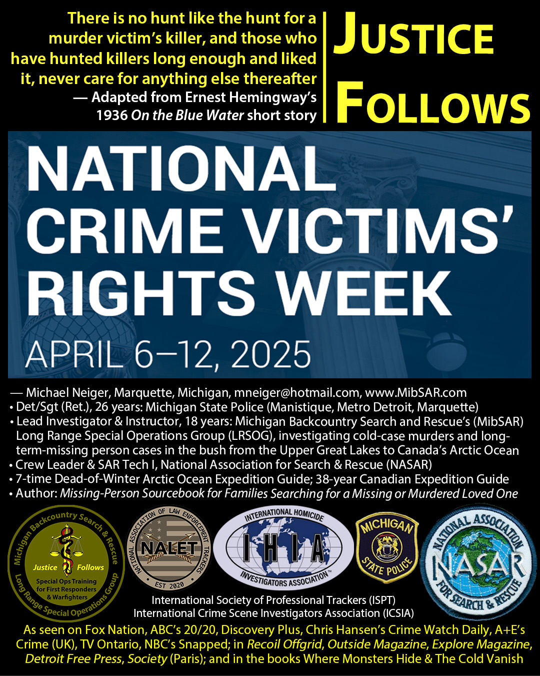 - April 10, 2025 THERE IS NO HUNT LIKE THE HUNT FOR A MURDER VICTIM’S KILLER, and those who have hunted killers long enough and liked it, never care for anything else thereafter -- Adapted from Ernest Hemingway’s 1936 “On the Blue Water” short story >> This week is National Crime Victim’s Rights Week and Team MibSAR remembers all those families awaiting justice for their loved ones. Keep the Faith, Justice Follows!
