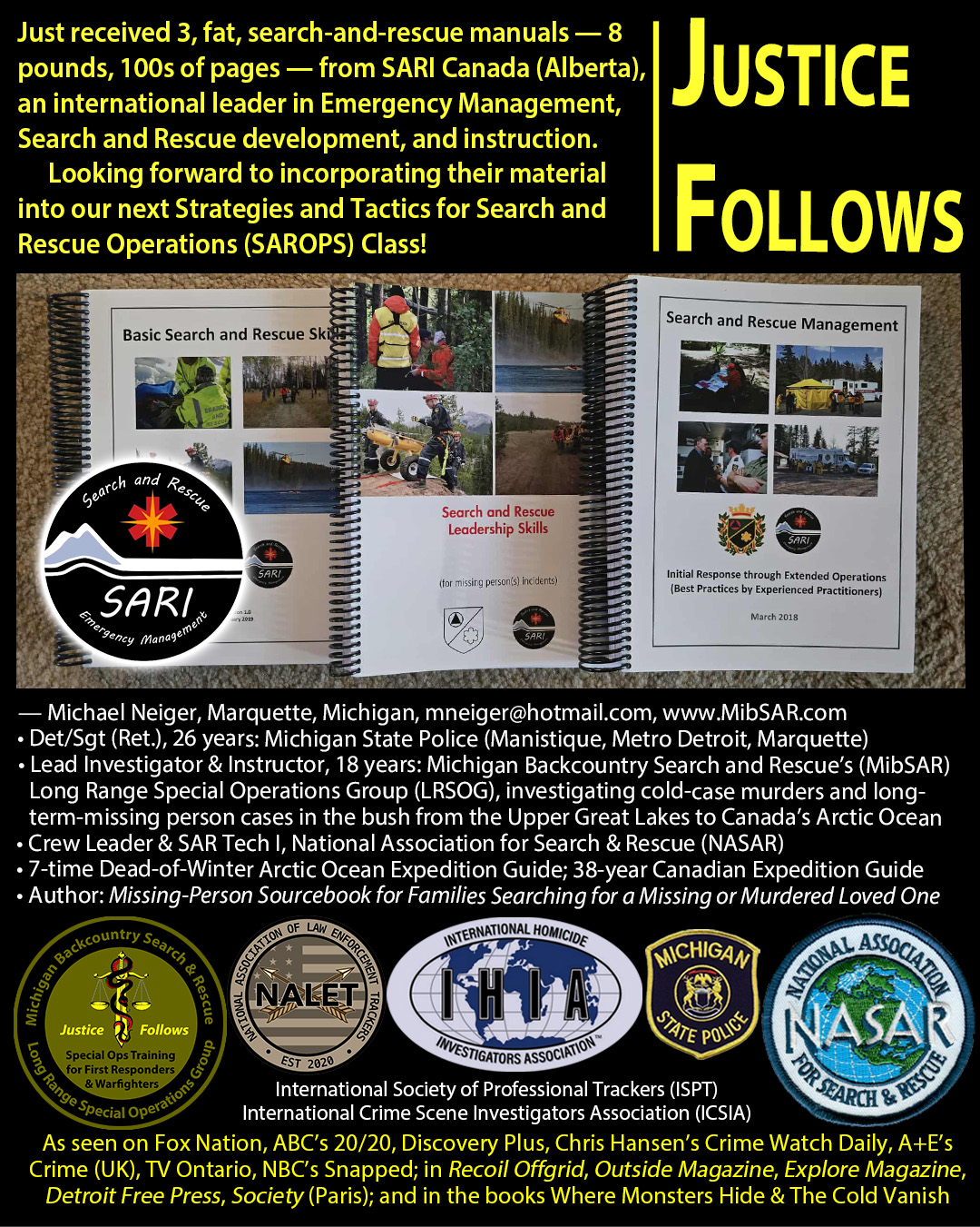 - April 28, 2025 Just received 3, fat, search-and-rescue manuals -- 8 pounds, 100s of pages -- from SARI Canada (Alberta), an international leader in Emergency Management, Search and Rescue development, and instruction. Looking forward to incorporating their material into our next Strategies and Tactics for Search and Rescue Operations (SAROPS) Class!