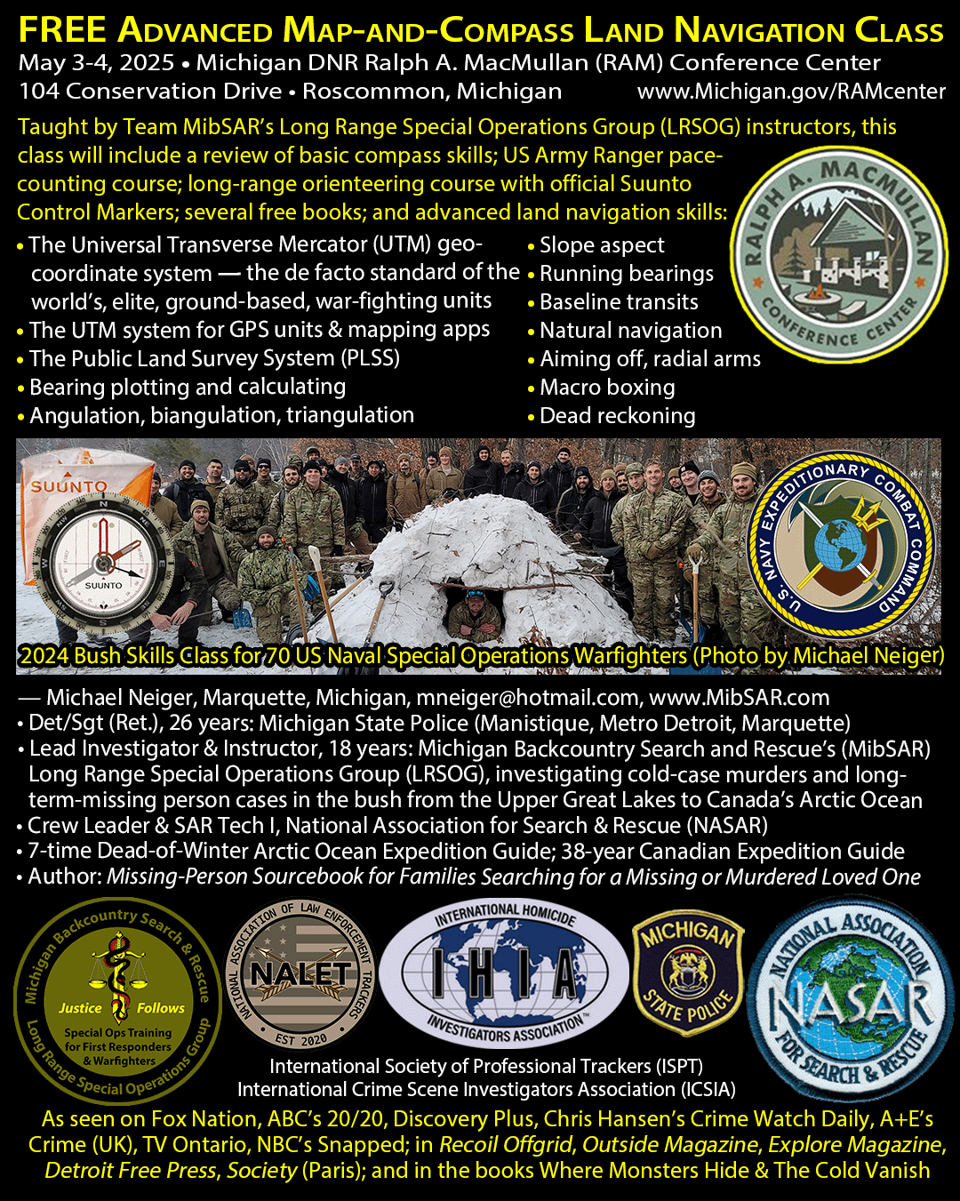 - May 3-4, 2025 Advanced Map-and-Compass Land Navigation Class (RAM Conference Center, Roscommon, Michigan)