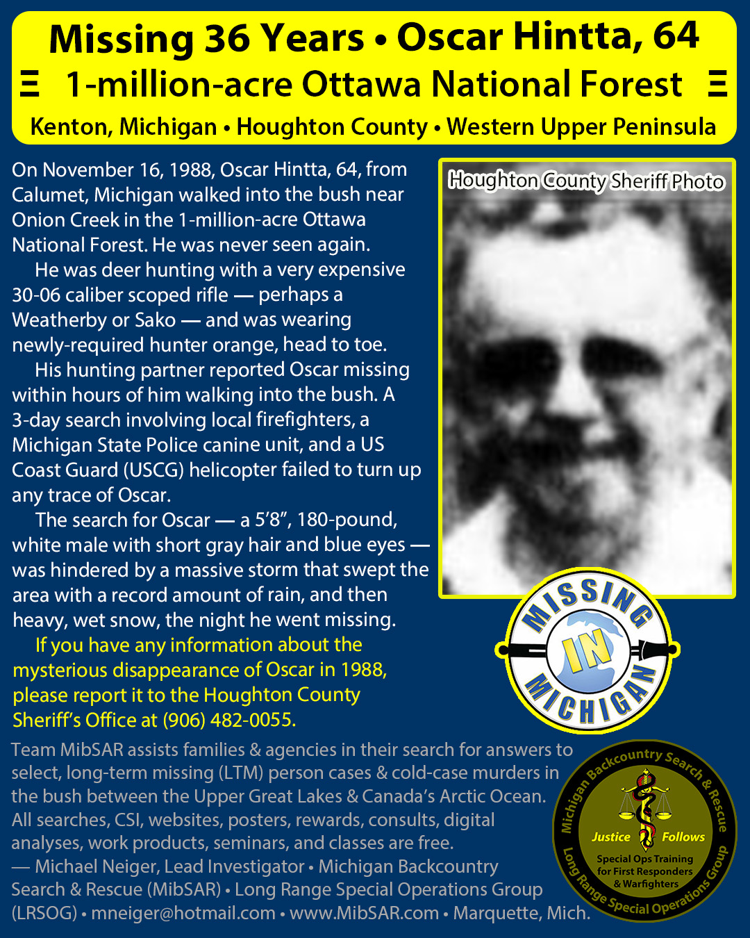 - August 6,7,8,11,12, 2025 Team MibSAR Long Range Special Operations Group (LRSOG) investigation, Oscar Hintta Case (Houghton County, Michigan)