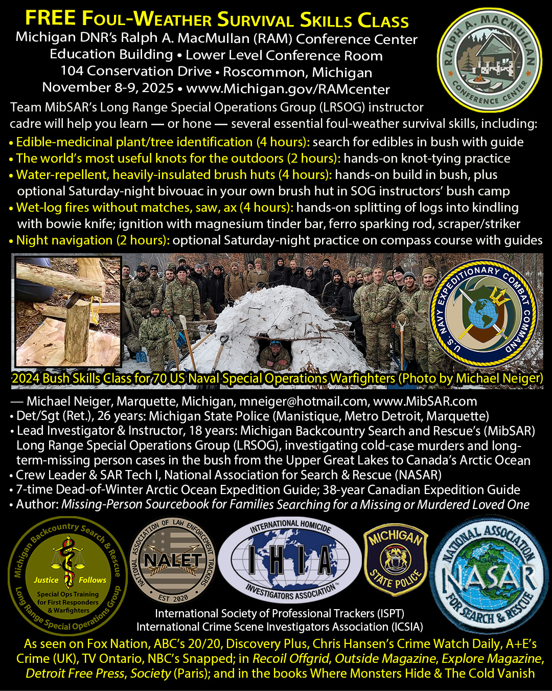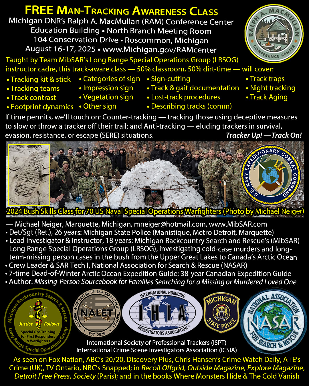 - August 16-17, 2025 Free Man-Tracking Awareness Class (Roscommon, Michigan • Crawford County • Northern Lower Peninsula) at the Ralph A. MacMullan (RAM) Conference Center in the Education Building, North Branch Meeting Room, 104 Conservation Drive, Roscommon, Michigan. Reserve a spot here