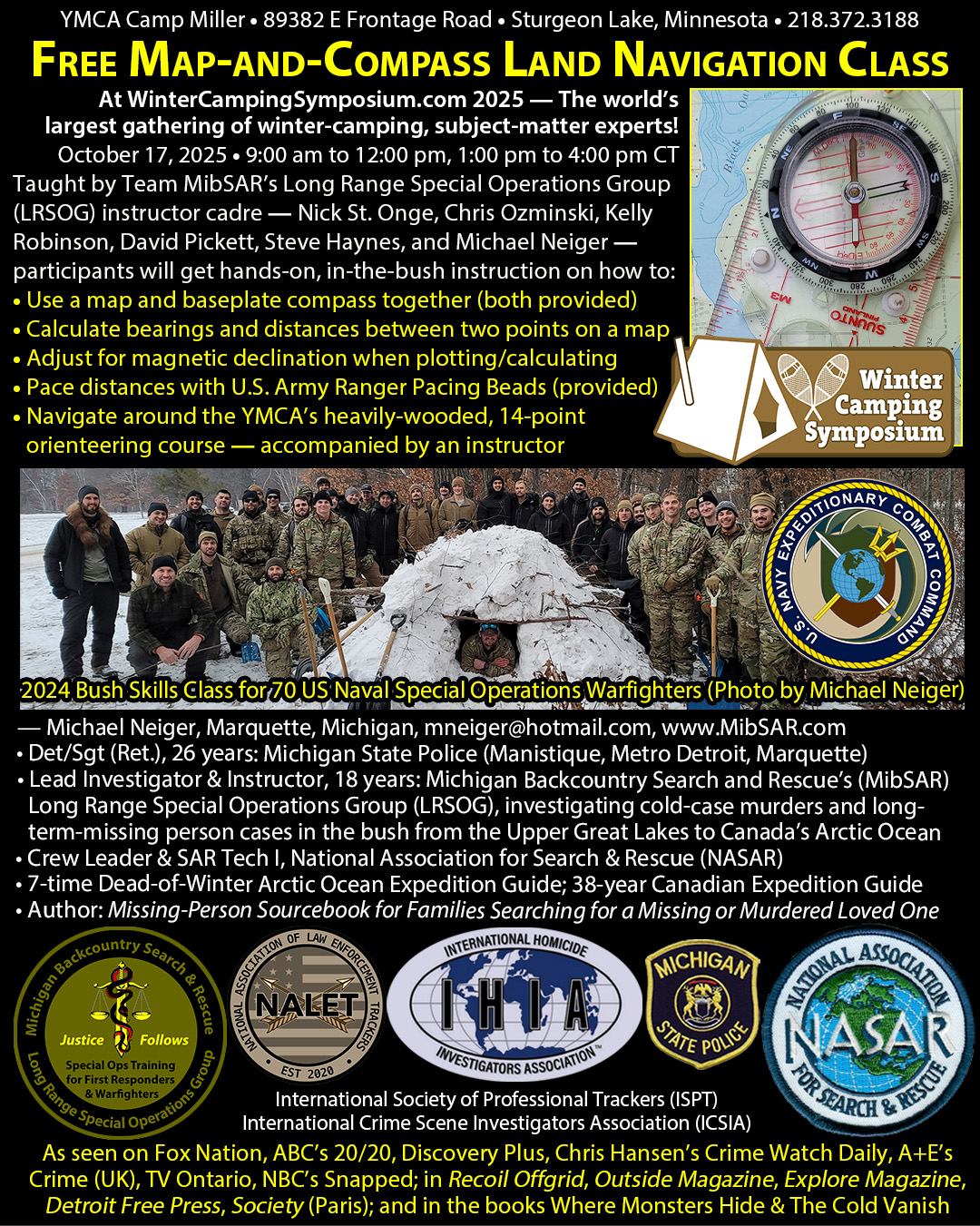 - October 17, 2025 Free Map-and-Compass Land Navigation Class, Winter Camping Symposium 2025, YMCA Camp Miller (Sturgeon Lake, Minnesota)