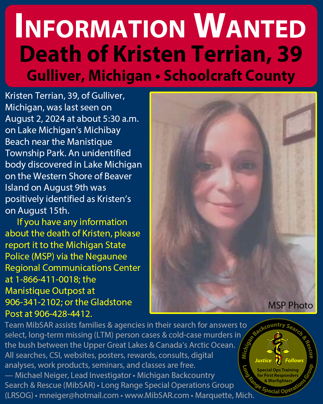 - August 16, 2024 Team MibSAR Long Range Special Operations Group (LRSOG) investigation Kristen Tarrian case (Manistique, Michigan)