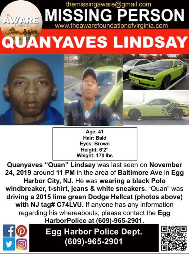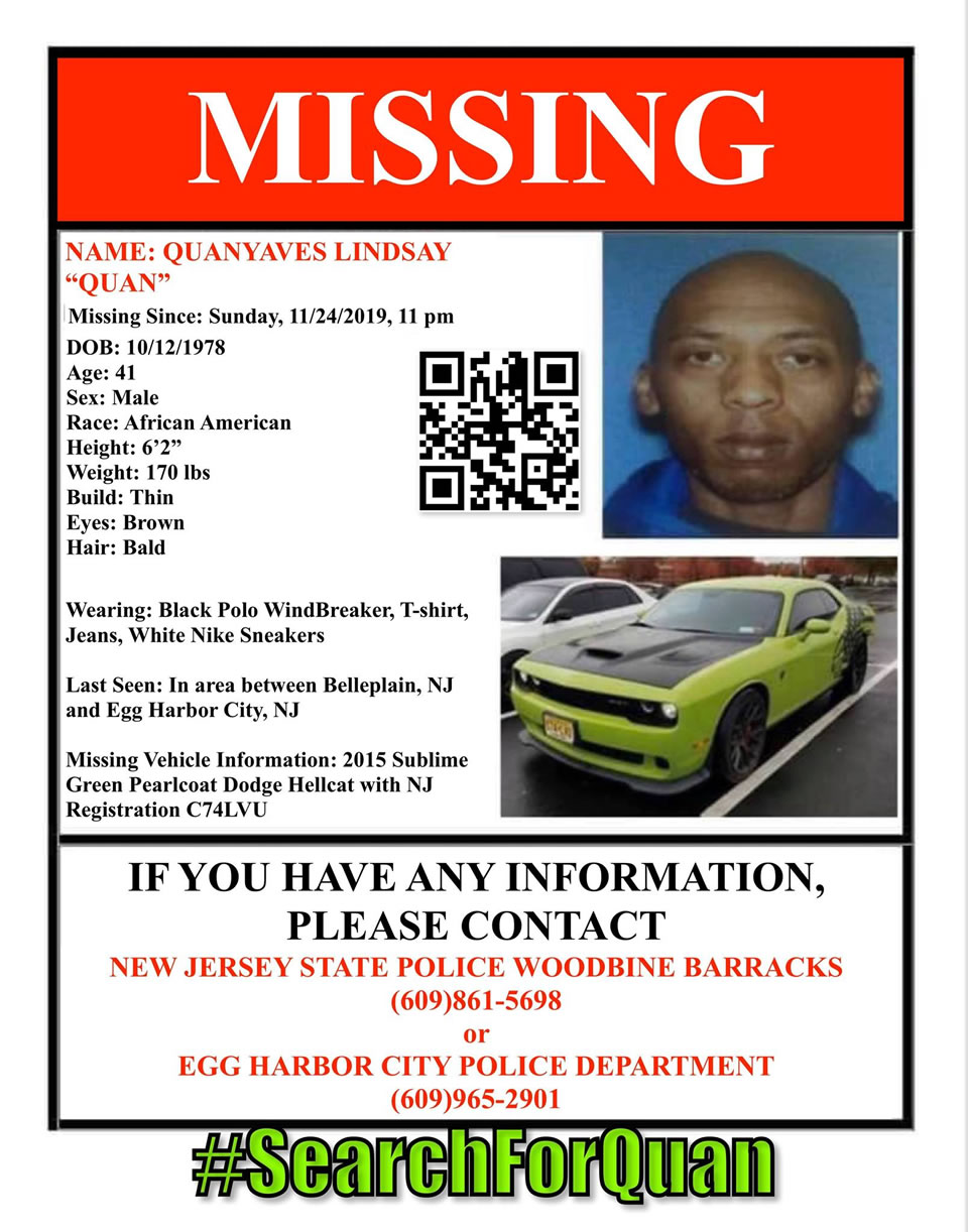 01-18-20 CASE UPDATE (Egg Harbor City, New Jersey): Sadly, Quan Lindsay was found deceased in a South Jersey creek in Cumberland County on January 11, 2020. Team MibSAR would like to express it condolences to the family and friends of Quan. New Jersey State Police are still searching for his 2015 green Dodge Hellcat with New Jersey license C74LVU. The New Jersey State Police Major Crimes South Unit is not releasing any further details at this time. Anyone with information about Quan's death or his Hellcat should call Detective Sgt. Robert Booth of the State Police Major Crimes South Unit at 609-610-4025. >> INFO www.pressofatlanticcity.com >> INFO www.nj.com >> HELP LAY QUAN TO REST GOFUNDME |