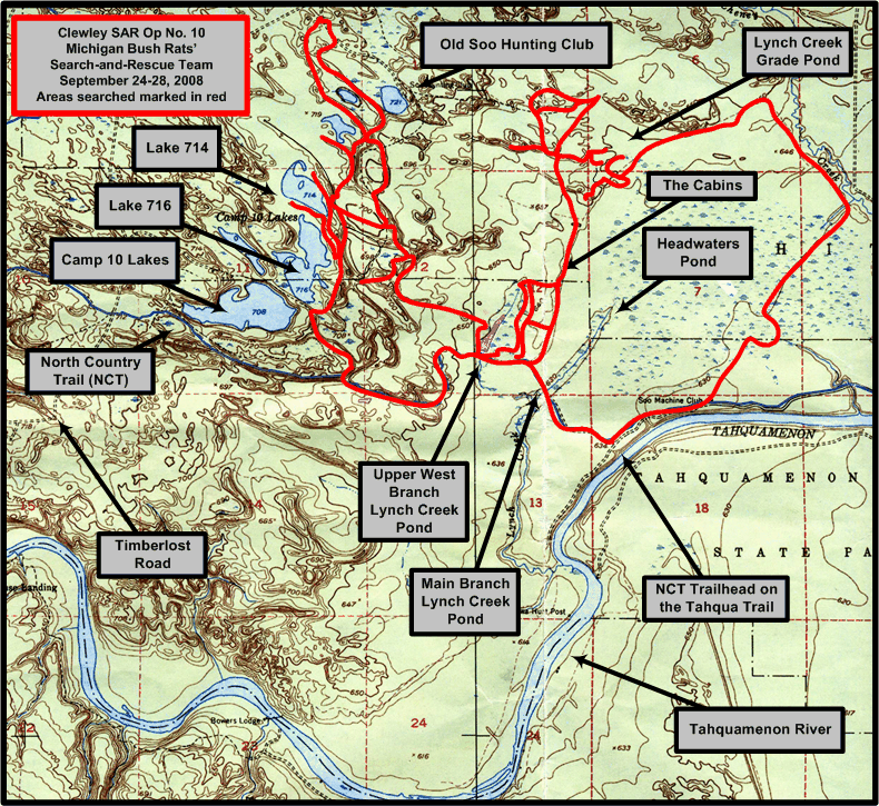 USGS quad showing areas searched (in red) by the Michigan Backcountry